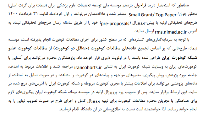 اولویت طرحهای پژوهشی بر تجمیع دادههای مطالعات کوهورت عضو شبکه کوهورت ایران در فراخوان خردادماه ۱۴۰۰ موسسه نیماد