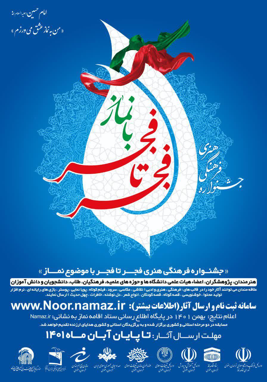 اطلاعیه فرهنگی جشنواره ی سراسری *فجر تا فجر* برگزاری جشنواره ی سراسری علمی،پژوهشی،فرهنگی،هنری،ادبی نماز نظر به برگزاری جشنواره ی سراسری علمی،پژوهشی،فرهنگی،هنری،ادبی نماز به عنوان * فجر تا فجر* که در بهمن ماه سال جاری که توسط شورای عالی اقامه ی نماز استان ها برگزار خواهد شد، علاقه مندان میتوانند جهت کسب اطلاعات بیشتر،ثبت نام و ارسال آثار با موضوع نماز در محورها و قالب های فرهنگی ،هنری ،ادبی (مقاله،کتاب،نقاشی،عکاسی،سرود،فیلم کوتاه،پویانمایی،پوستر،بازی های رایانه ای،نرم افزار،خوشنویسی،قصه کوتاه،انواع شعر،دل نوشته،خاطرات،چهل حدیث )به سامانه https://noor.namaz.iمراجعه نمایند. مهلت شرکت در فراخوان 30 آبان ماه سال جاری میباشد.به برگزیدگان استانی و کشوری هدایای ارزنده ای تقدیم خواهد شد.