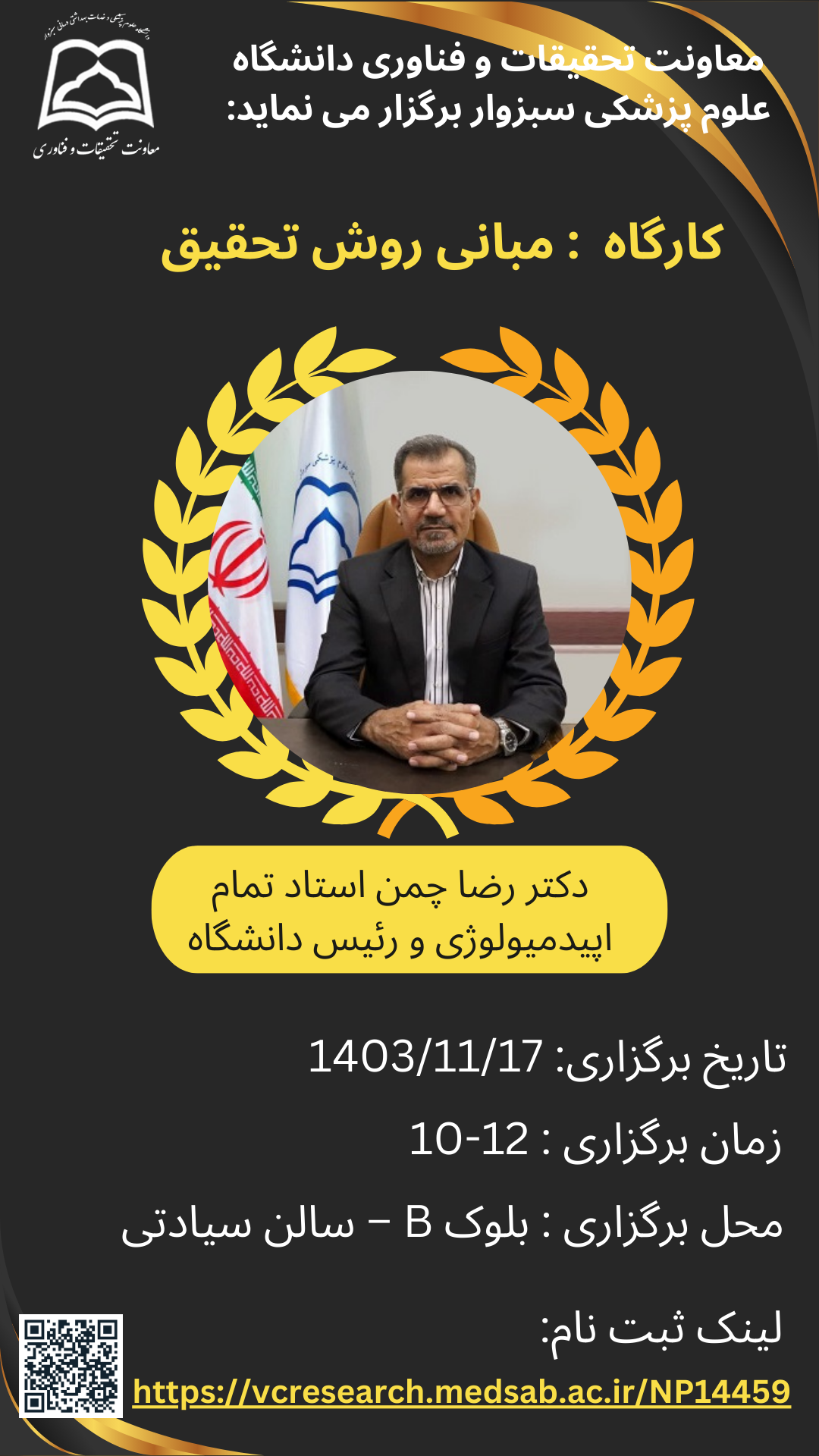کارگاه مبانی روش تحقیق با ارائه ریاست محترم دانشگاه جناب آقای دکتر چمن کارگاه : مبانی روش تحقیق مدرس: دکتر رضا چمن استاد تمام اپیدمیولوژی و رئیس دانشگاه تاريخ برگزاري:17/11/1403 زمان برگزاري : 12-10 محل برگزاری : بلوک B - سالن سیادتی لینک ثبت نام: https://vcresearch.medsab.ac.ir/NP14459