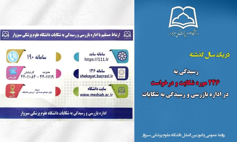 رسیدگی به ۲۴۶ مورد شکایت و درخواست در اداره بازرسی و رسیدگی به شکایات دانشگاه علوم پزشکی سبزوار به گزارش وبدا، اداره بازرسی و رسیدگی به شکایات دانشگاه علوم پزشکی سبزوار در یک سال گذشته به ۲۴۶ مورد شکایت و درخواست در حوزههای مختلف دانشگاه رسیدگی کرده است. این موارد شامل شکایات، پیشنهادات و درخواستهای مرتبط با بخشهای آموزشی، درمانی، بهداشتی، اداری و پشتیبانی دانشگاه بوده که پس از بررسی دقیق و ارجاع به واحدهای مربوطه، اقدامات لازم در خصوص آنها صورت گرفته است.