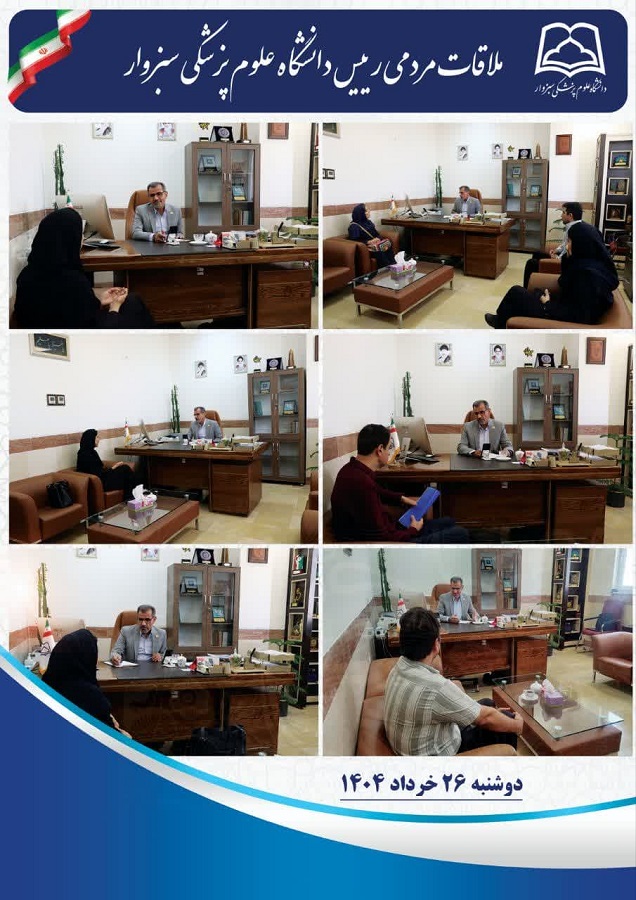 گزارش تصویری از ملاقات مردمی با رئیس دانشگاه علوم پزشکی سبزوار در راستای تکریم اربابرجوع و اهتمام به حل مسائل حوزه سلامت، دکتر چمن، رئیس دانشگاه علوم پزشکی سبزوار، روز دوشنبه ۲۶ خرداد ۱۴۰۴ با جمعی از مراجعین دیدار کرد. در این نشست صمیمی، رئیس دانشگاه ضمن پاسخگویی به درخواستها و پرسشهای حضار، برخی موارد را نیز بهصورت تلفنی و در همان جلسه پیگیری و رسیدگی کرد.