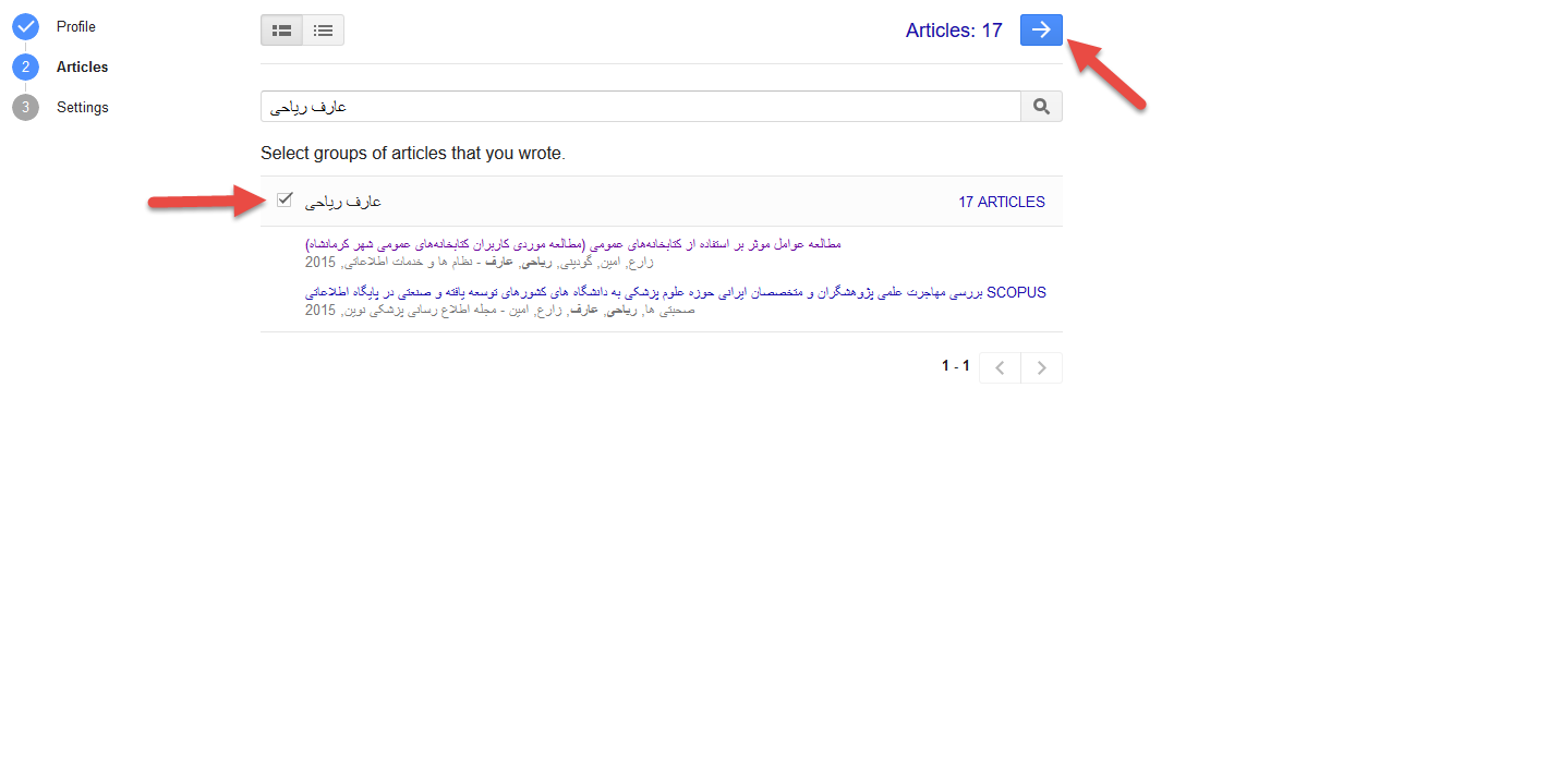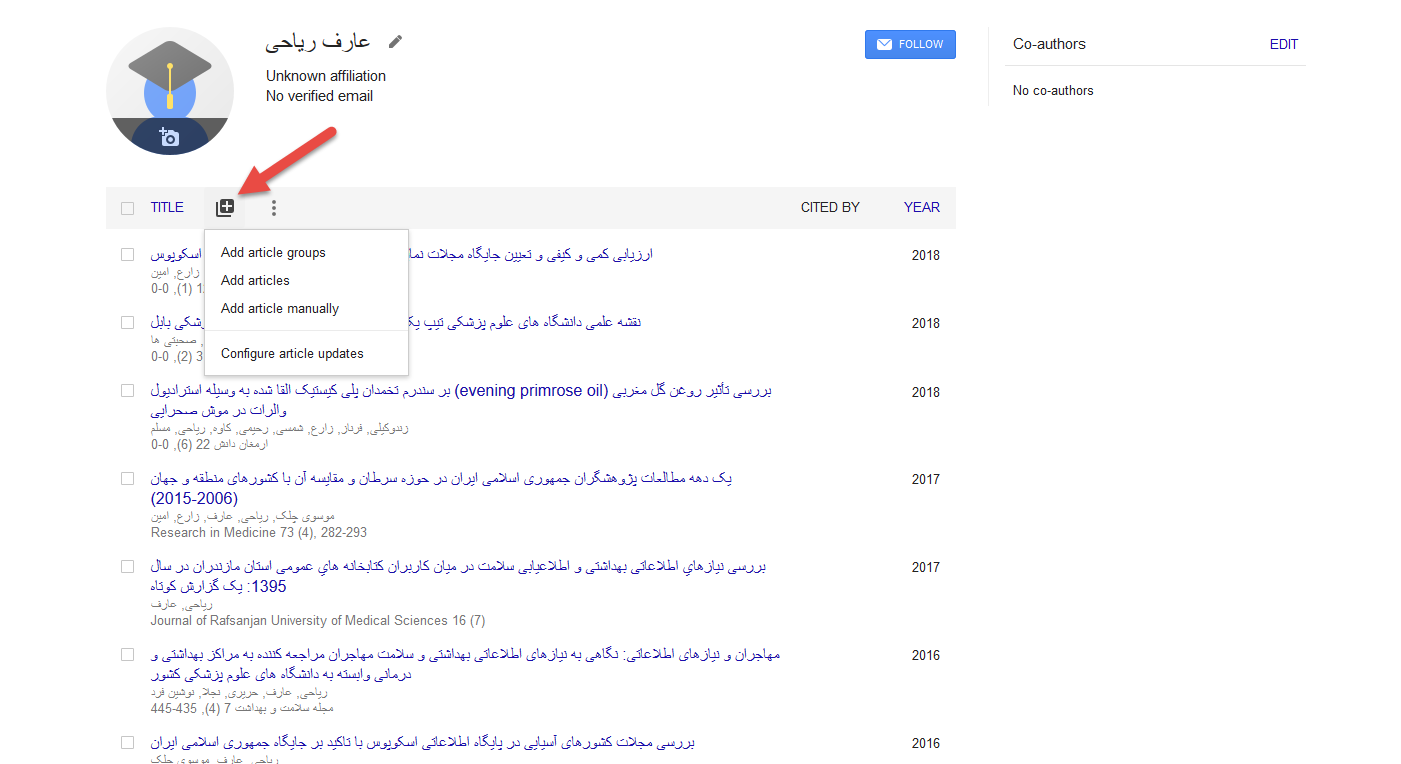 در این مرحله می توانید مقالاتی که در لیست مقالات شما موجود نیست را اضافه نمایید. برای این منظور بر روی علامت مشخص شده در شکل زیر کلیک نموده و یکی از موارد موجود را انتخاب نمایید: 1. اضافه کردن گروهی مقالات (این گزینه در مواقعی کاربرد دارد که نویسنده دارای چند نام به شکل نوشتاری باشد) 2. اضافه کردن یک یا چند مقاله خاص که در لیست وجود ندارد 3. اضافه کردن مقاله یا مدرک دیگری به صورت دستی.