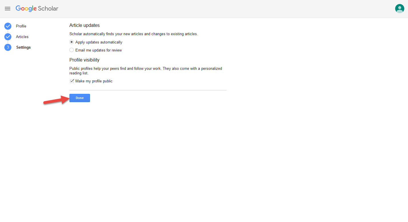 در مرحله بعد می توانید تنظیم نمایید که آپدیت مقالات و ... به صورت خودکار باشد و یا ایمیلی برایتان ارسال شود تا خودتان اضافه نمایید. هم چنین می توانید پروفایل خود را عمومی کنید تا همه به اطلاعات مقالات، استنادات و ... دسترسی داشته باشند. بر روی Done کلیک نمایید تا این مراحل تمام شود.