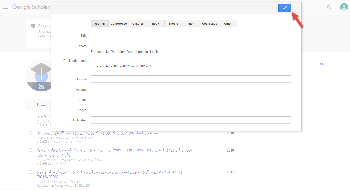 در صورتی که مقاله شما در لیست وجود نداشت و با جستجوی عنوان و ... نتوانستید آن را بیابید (در گوگل اسکالر نمایه نشده بود) می توانید آن را به صورت دستی اضافه نمایید. برای این منظور گزینه سوم را انتخاب کرده و در فرم ظاهر شده اطلاعات مقاله یا مدرک مورد نظر خود را وارد نمایید.