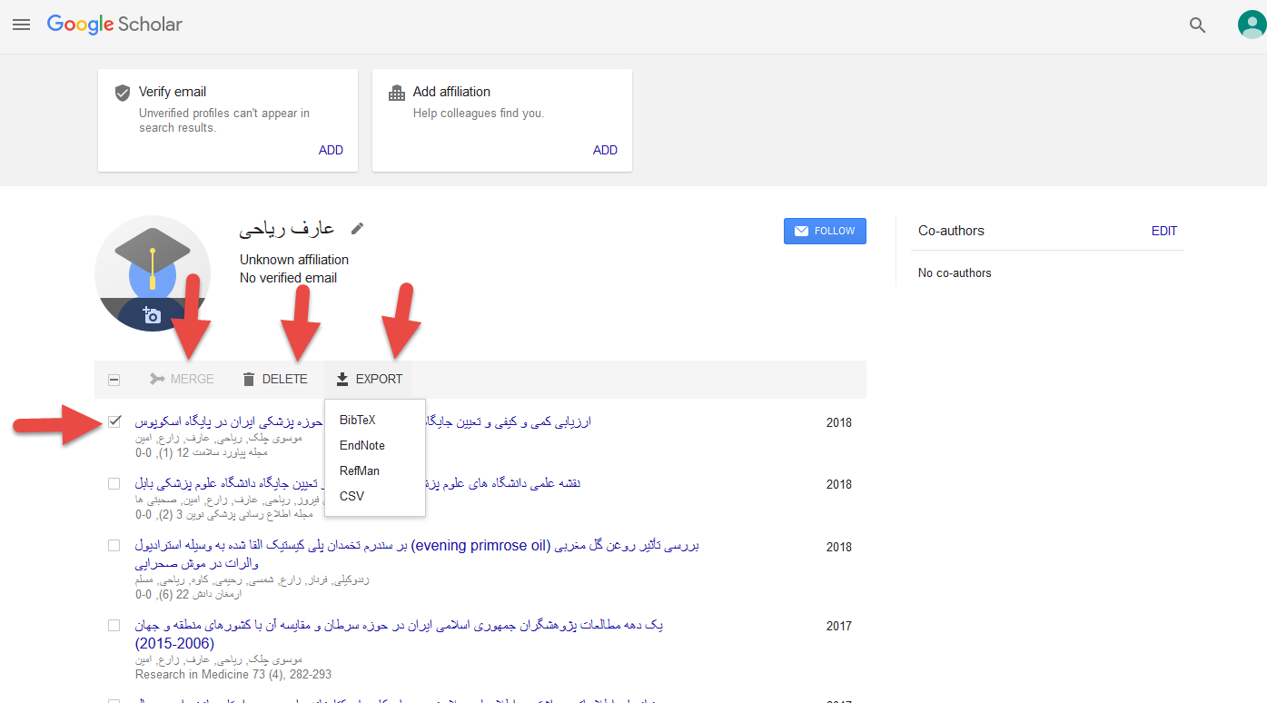 بعد از اضافه کردن تمامی مقالات به لیست مقالات خود لازم است بررسی نمایید و در صورتی که مقاله ای متعلق به شما نبود آن را حذف نموده و موارد تکراری را با هم Merge نمایید. هم چنین می توانید از مقالات خود با فرمت های متنوع خروجی بگیرید (برای استفاده از این قابلیت ها لازم است حداقل یا دو مدرک را انتخاب کرده باشید).