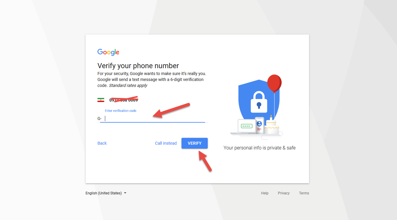 گوگل کدی به صورت پیامک برای شما می فرستد که می بایست آن را در کادر مربوطه وارد کرده و بر روی گزینه Verify کلیک نمایید.