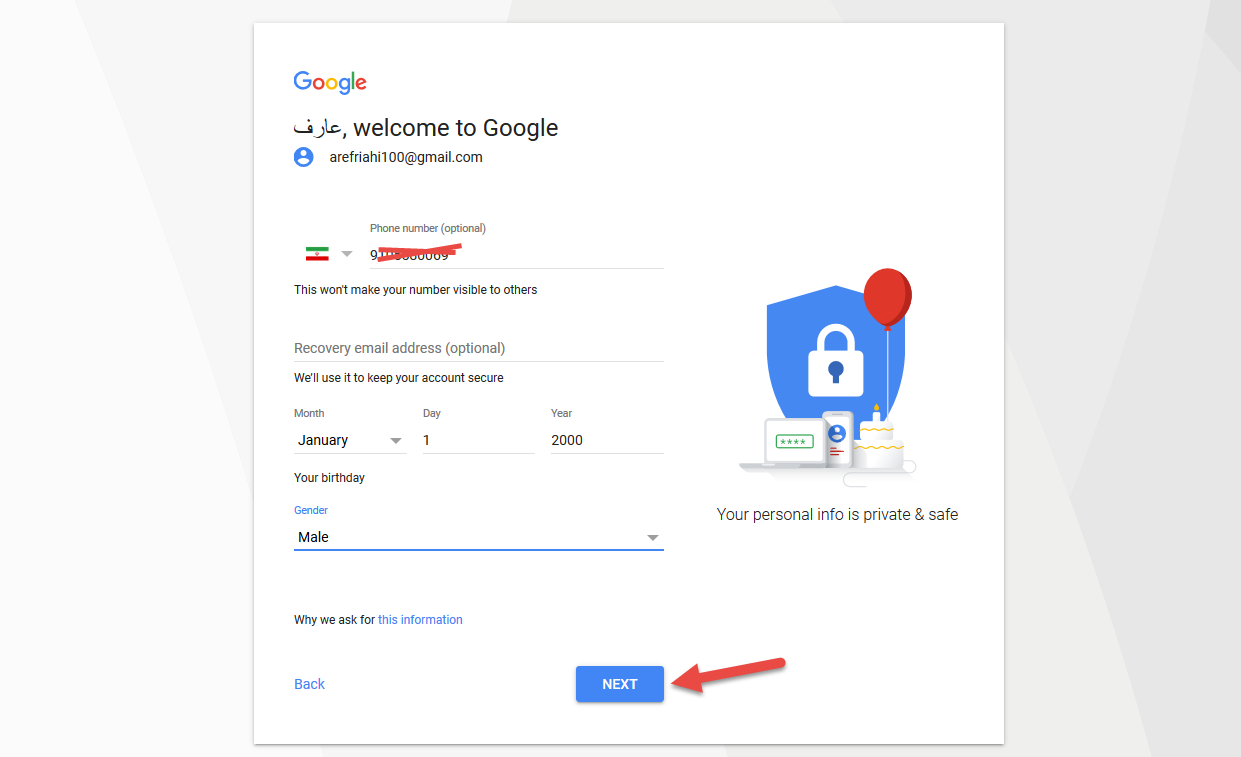 در مرحله بعد اطلاعات خود را کامل نموده و بر روی Next کلیک نمایید.